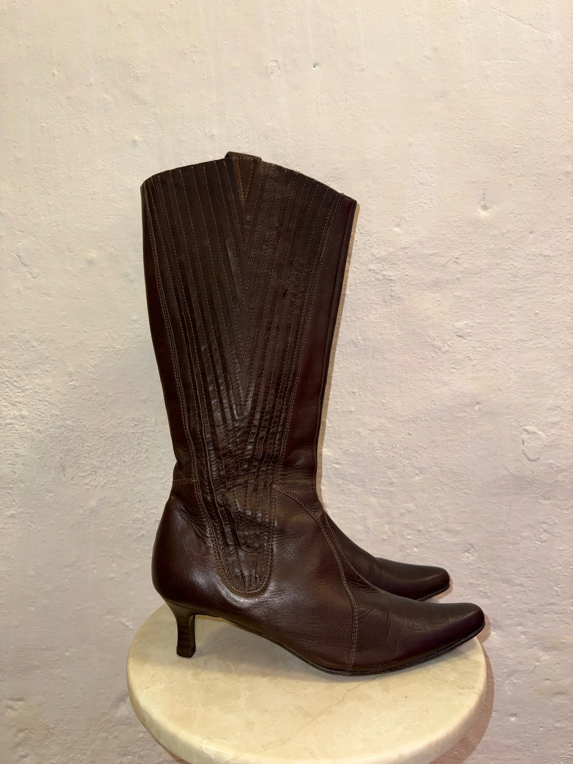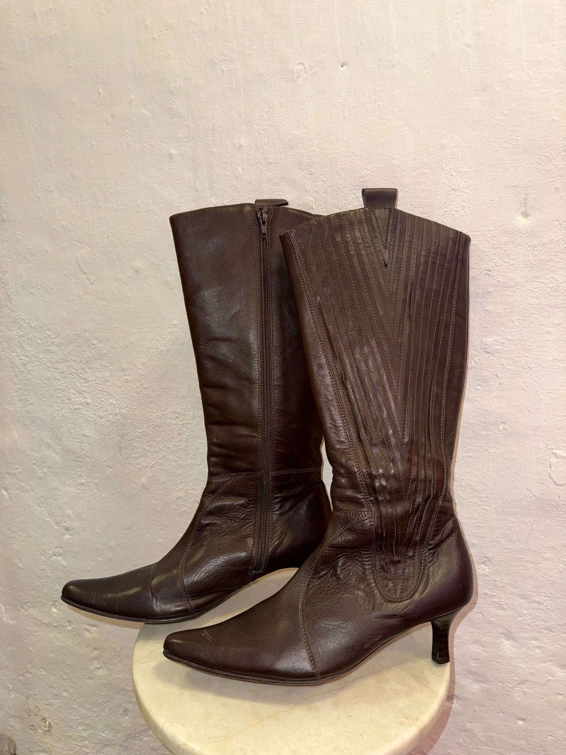 These dark brown just below the knee boots made from real leather. The kitten heel is the perfect height for everyday, and they are very comfortable. The side zip makes them easy to get on and off.