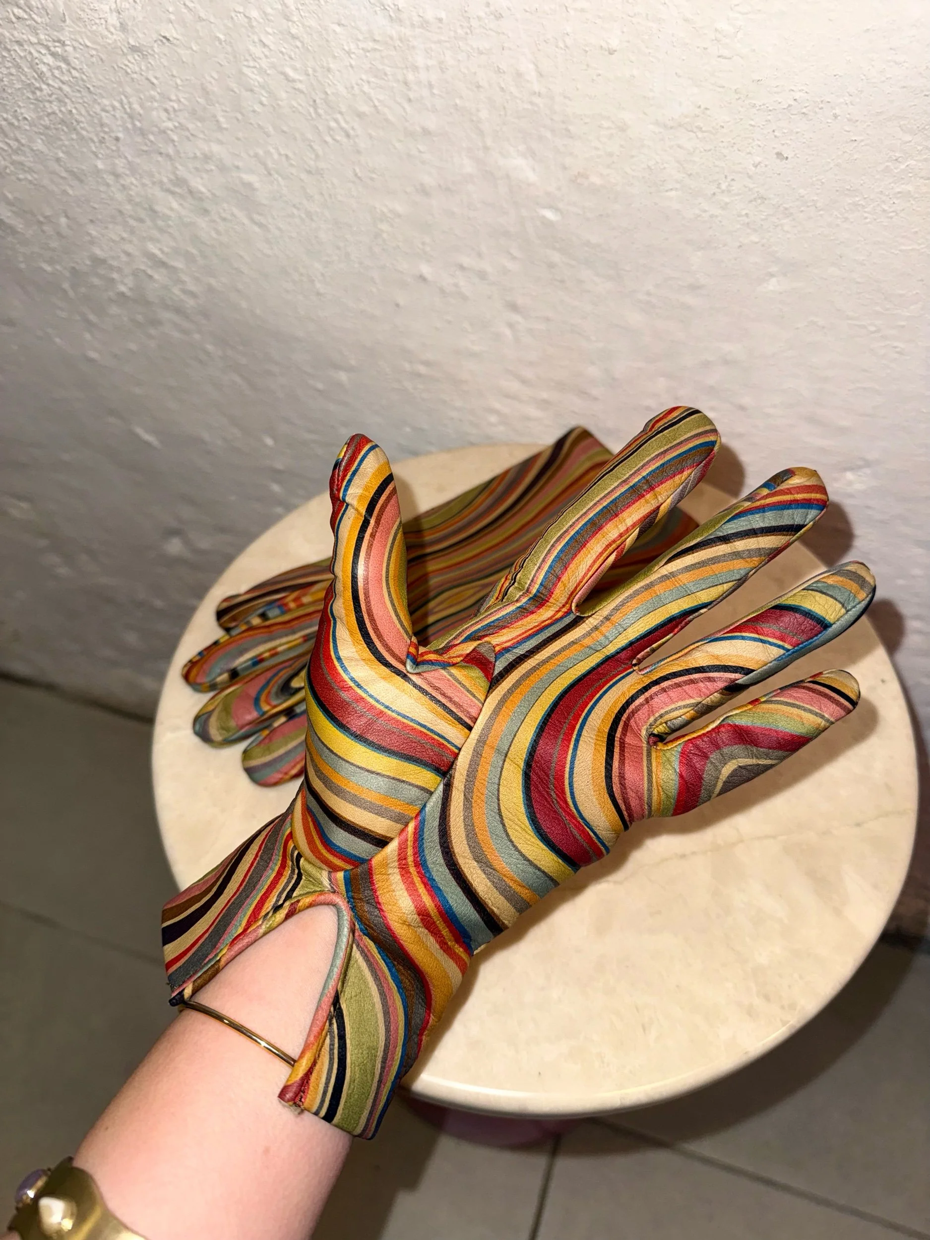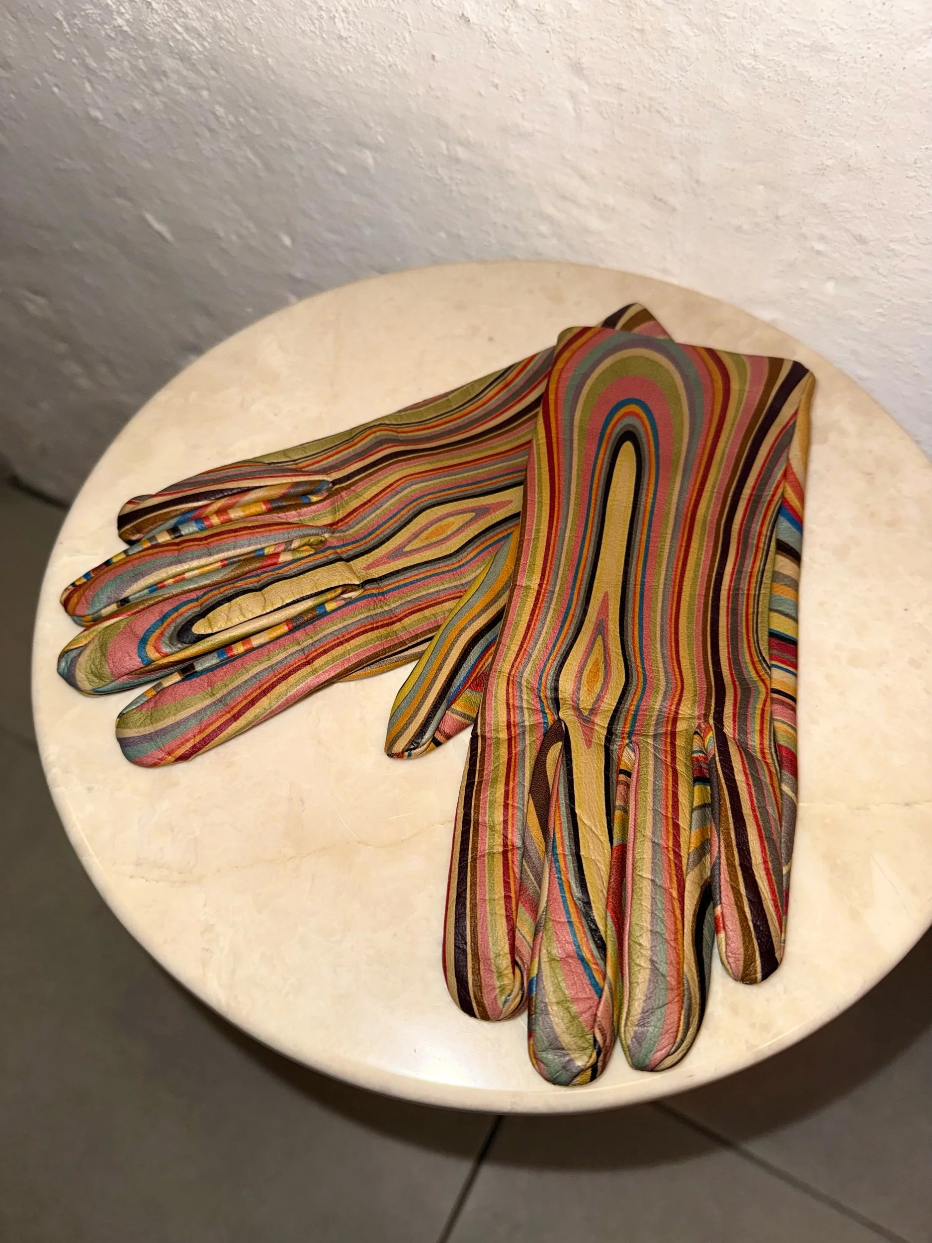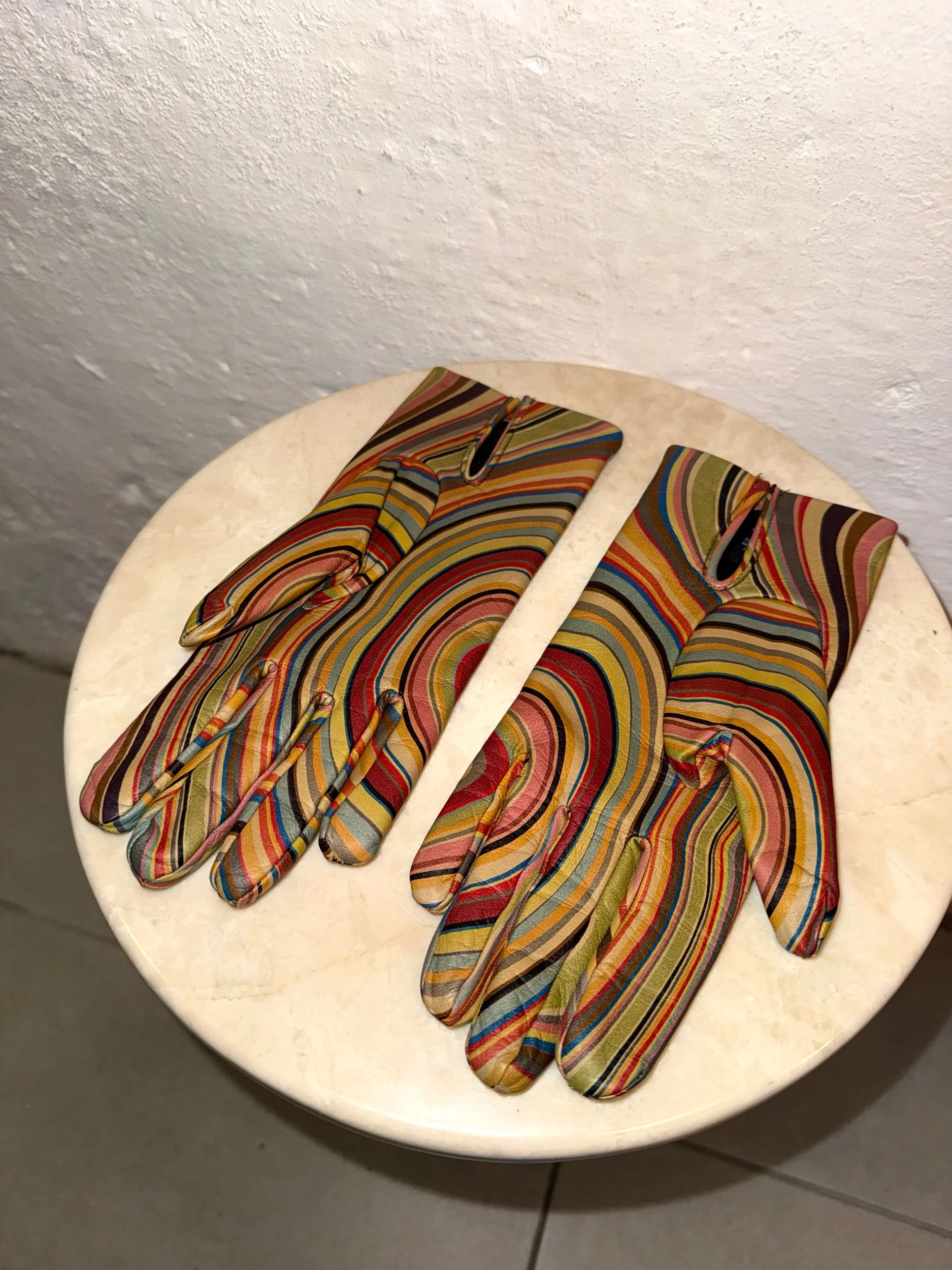 Early 2000’s Paul Smith original signature swirl print leather gloves. These items are extremely collectible and sought after as PS discontinued this beloved print, the gloves are a particularly rare piece. It is also very rare to find them in such good condition!