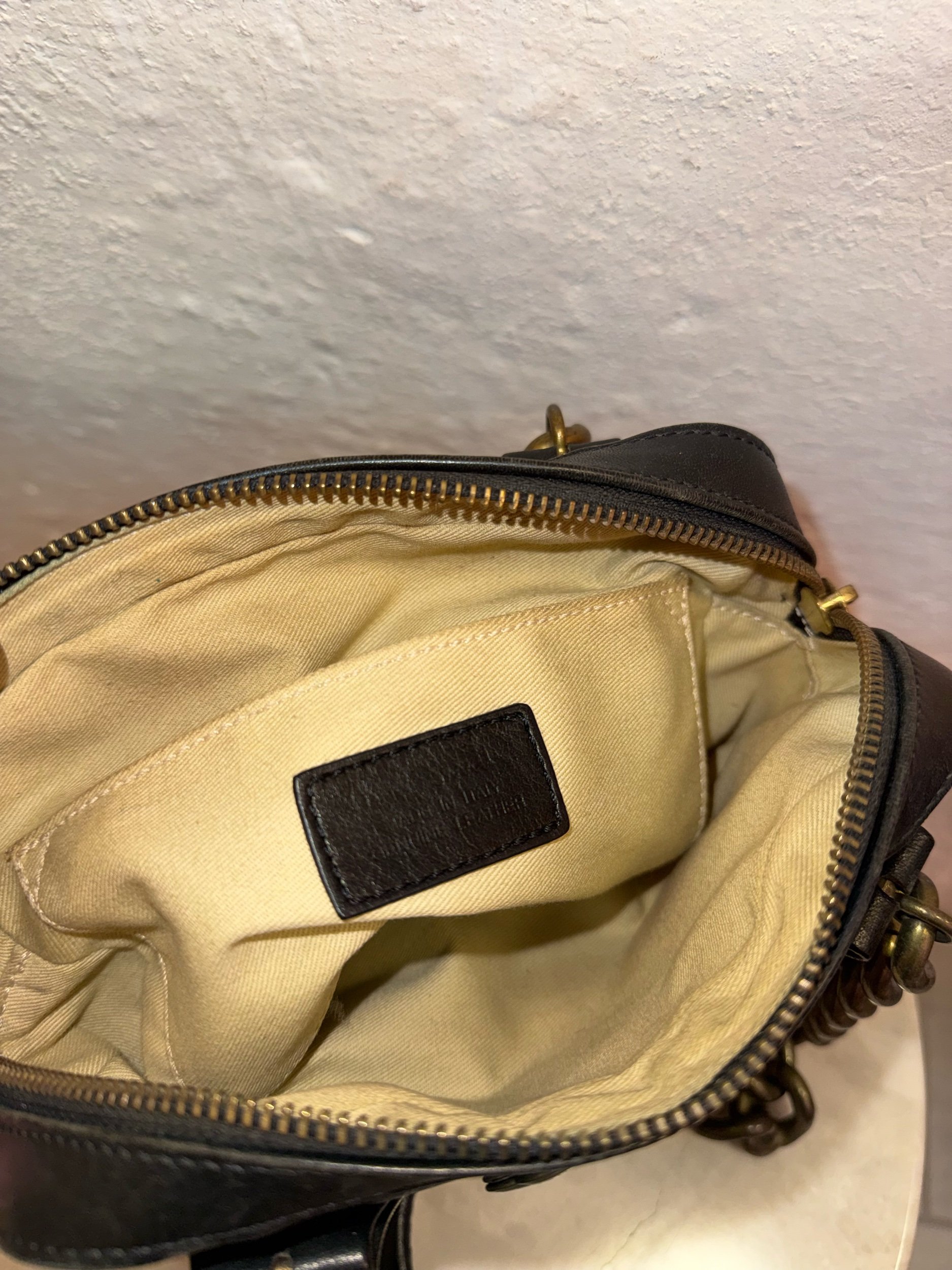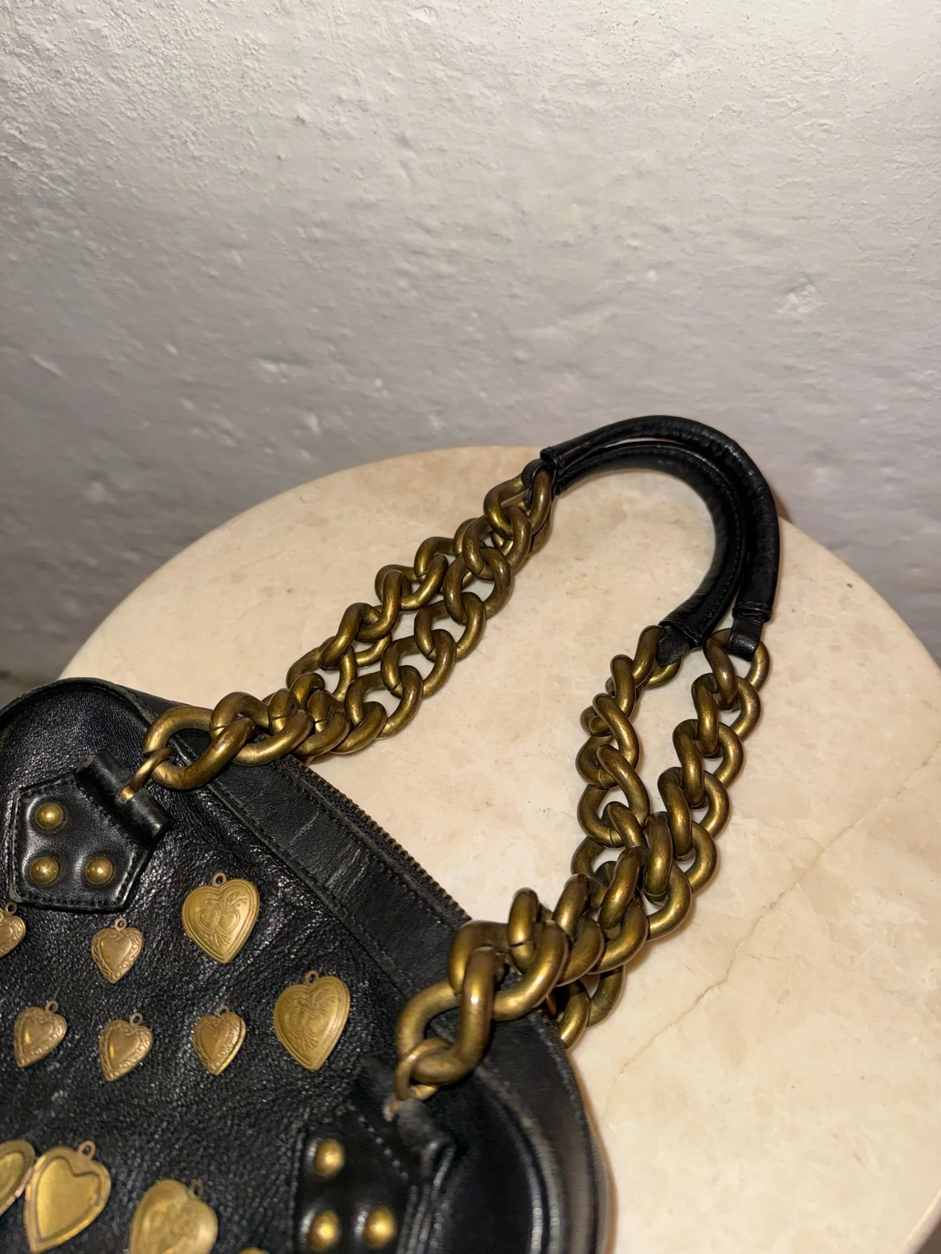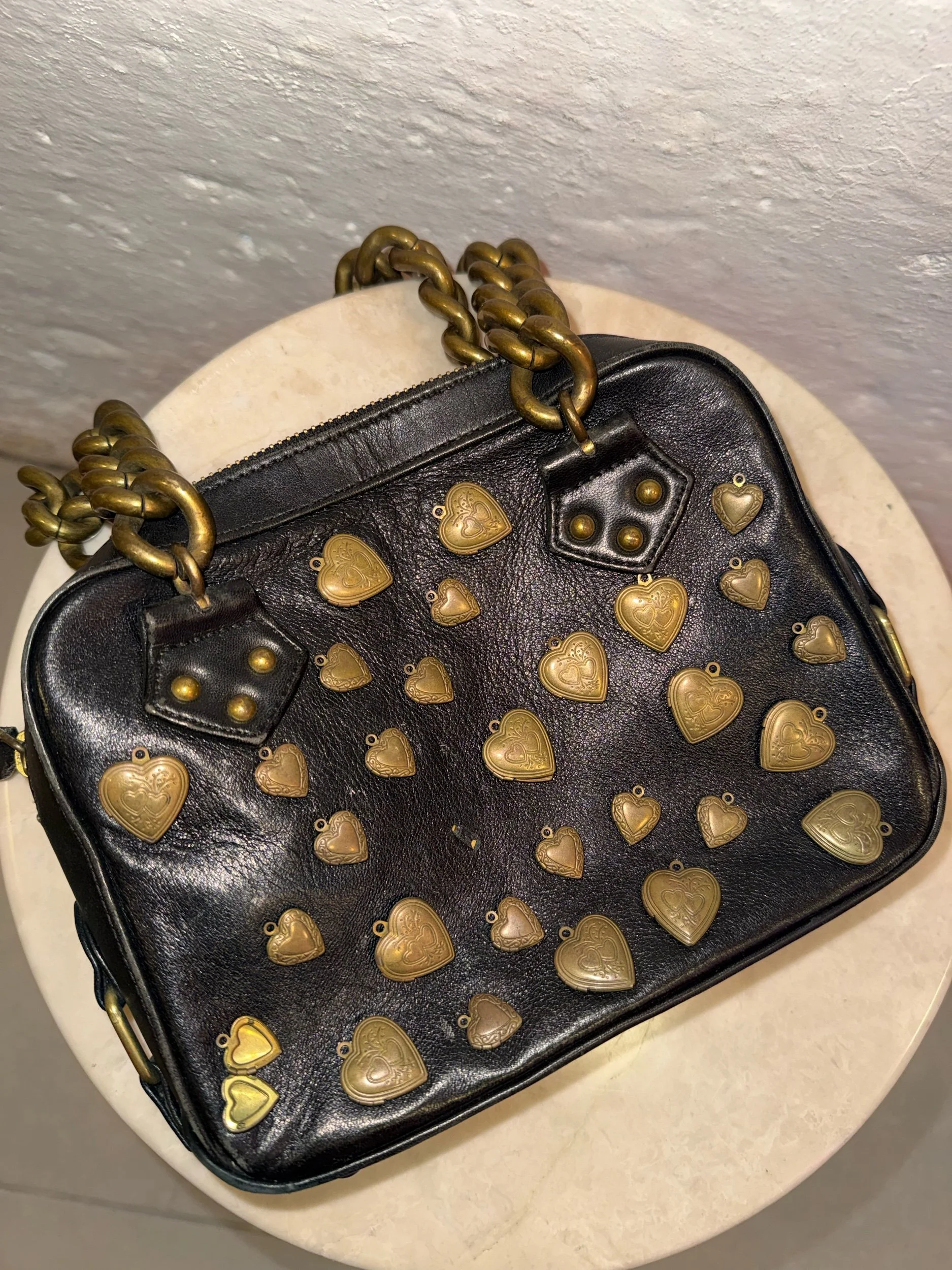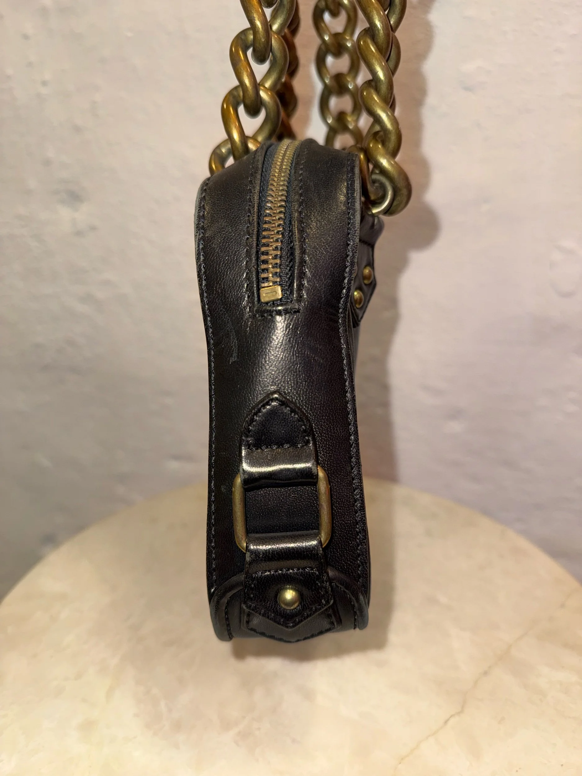 Early 2000’s Paul Smith black leather shoulder bag with brass chain strap and locket detailing. This is a very rare piece.