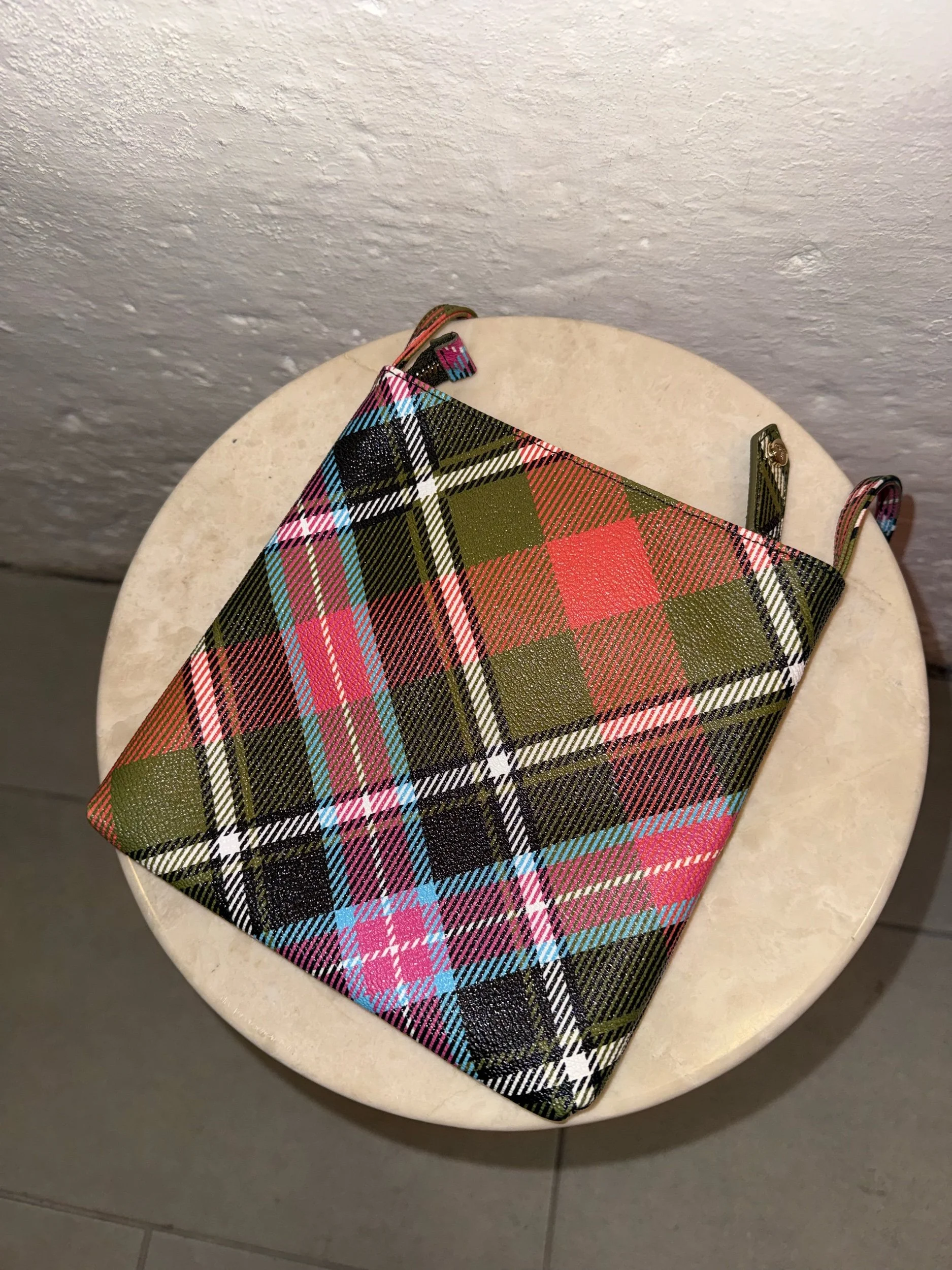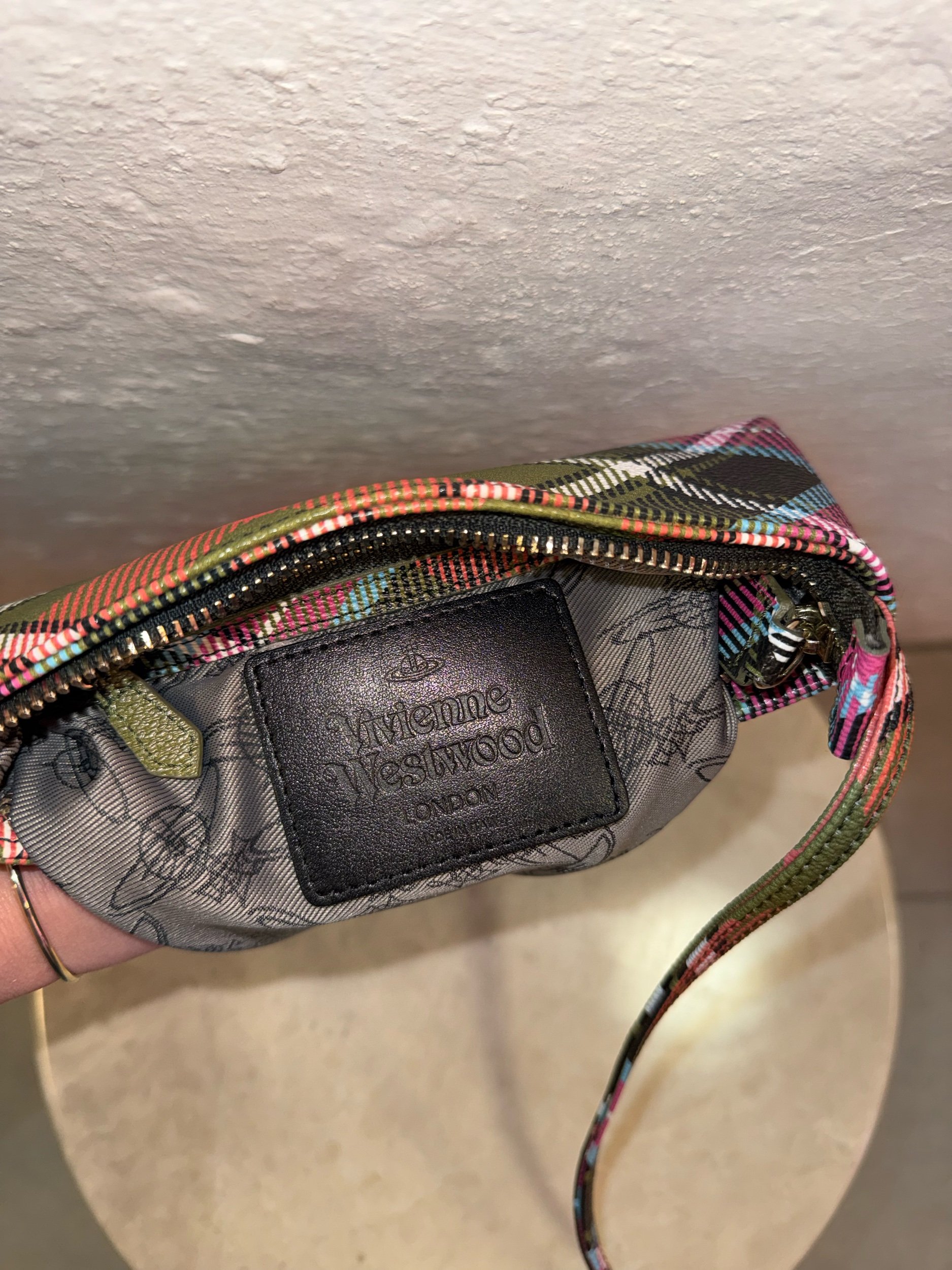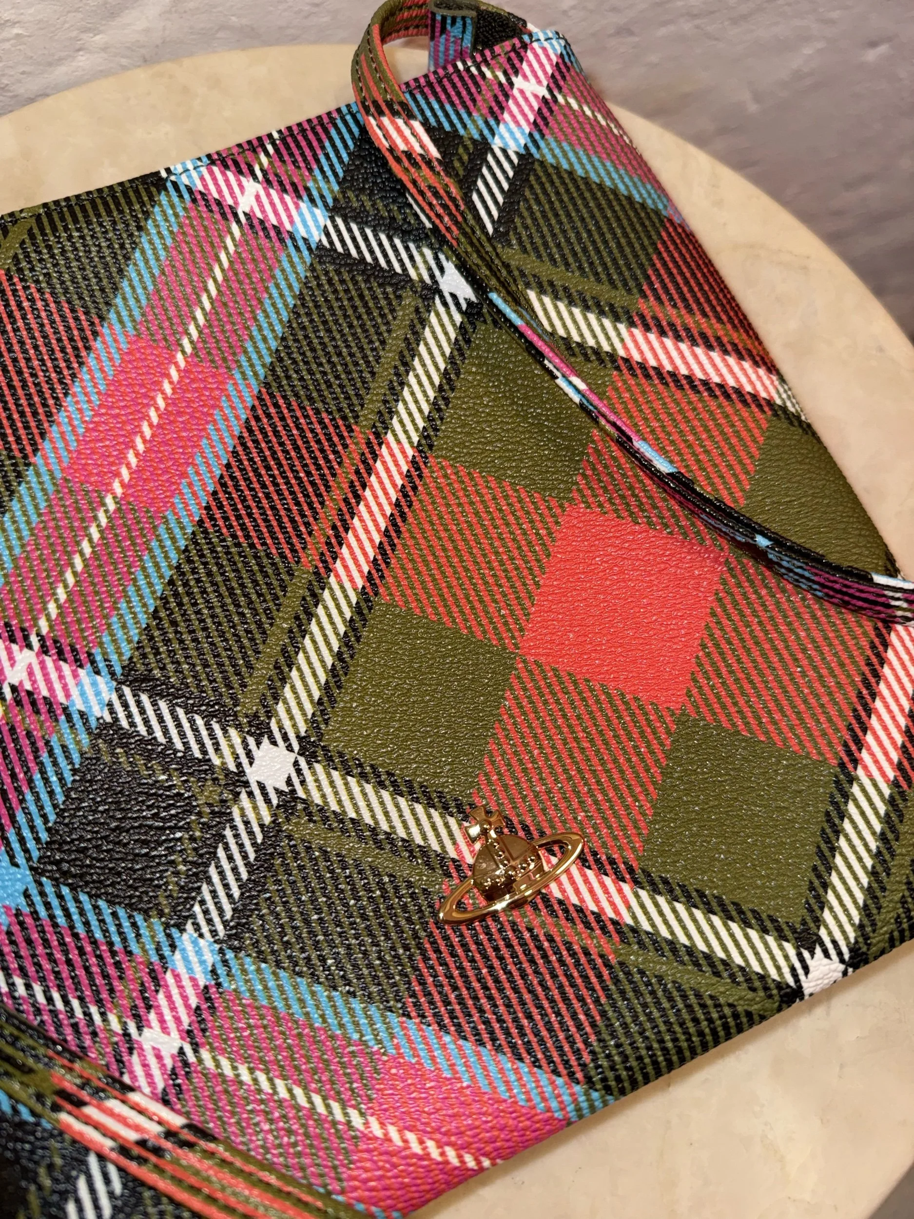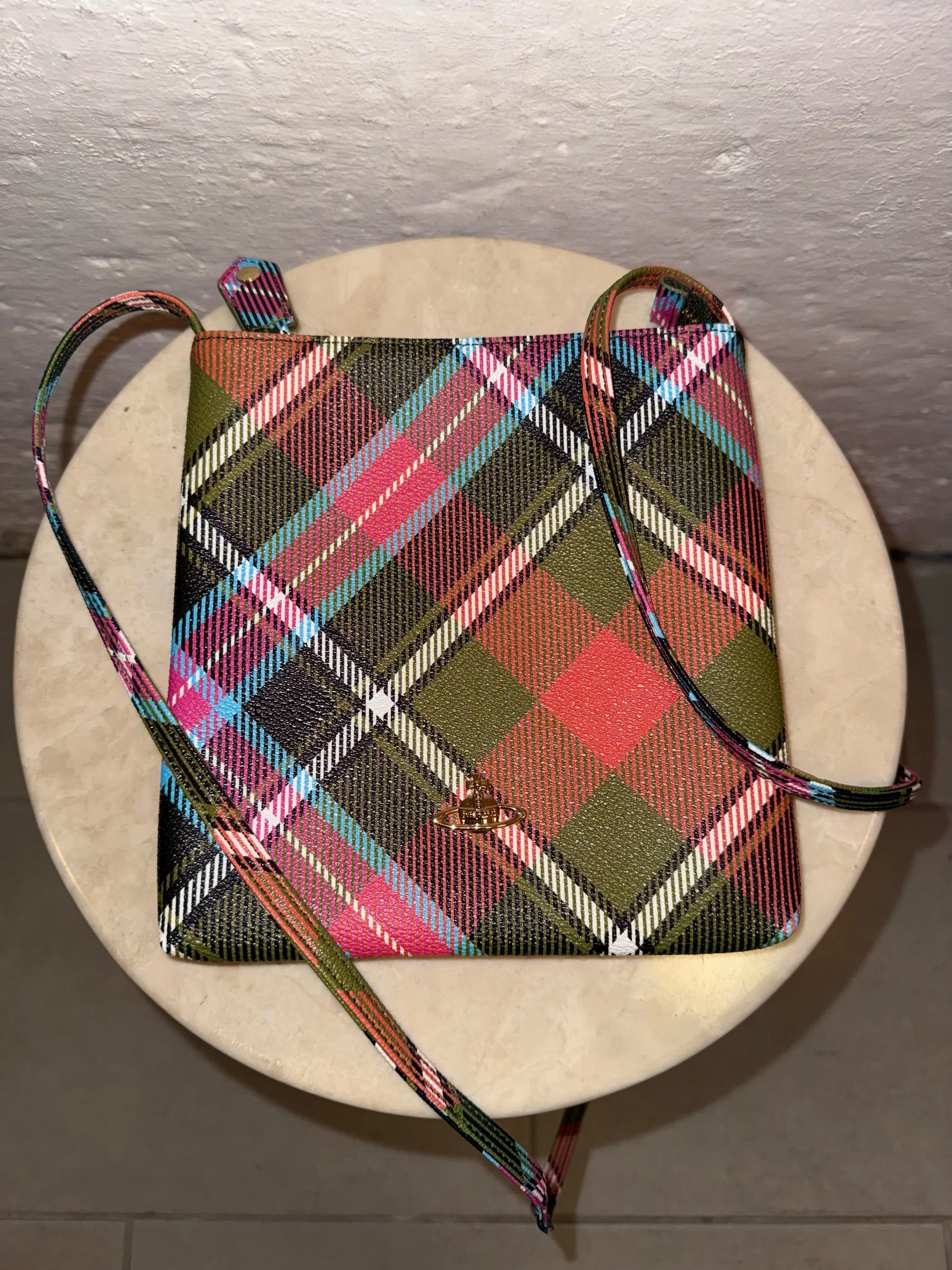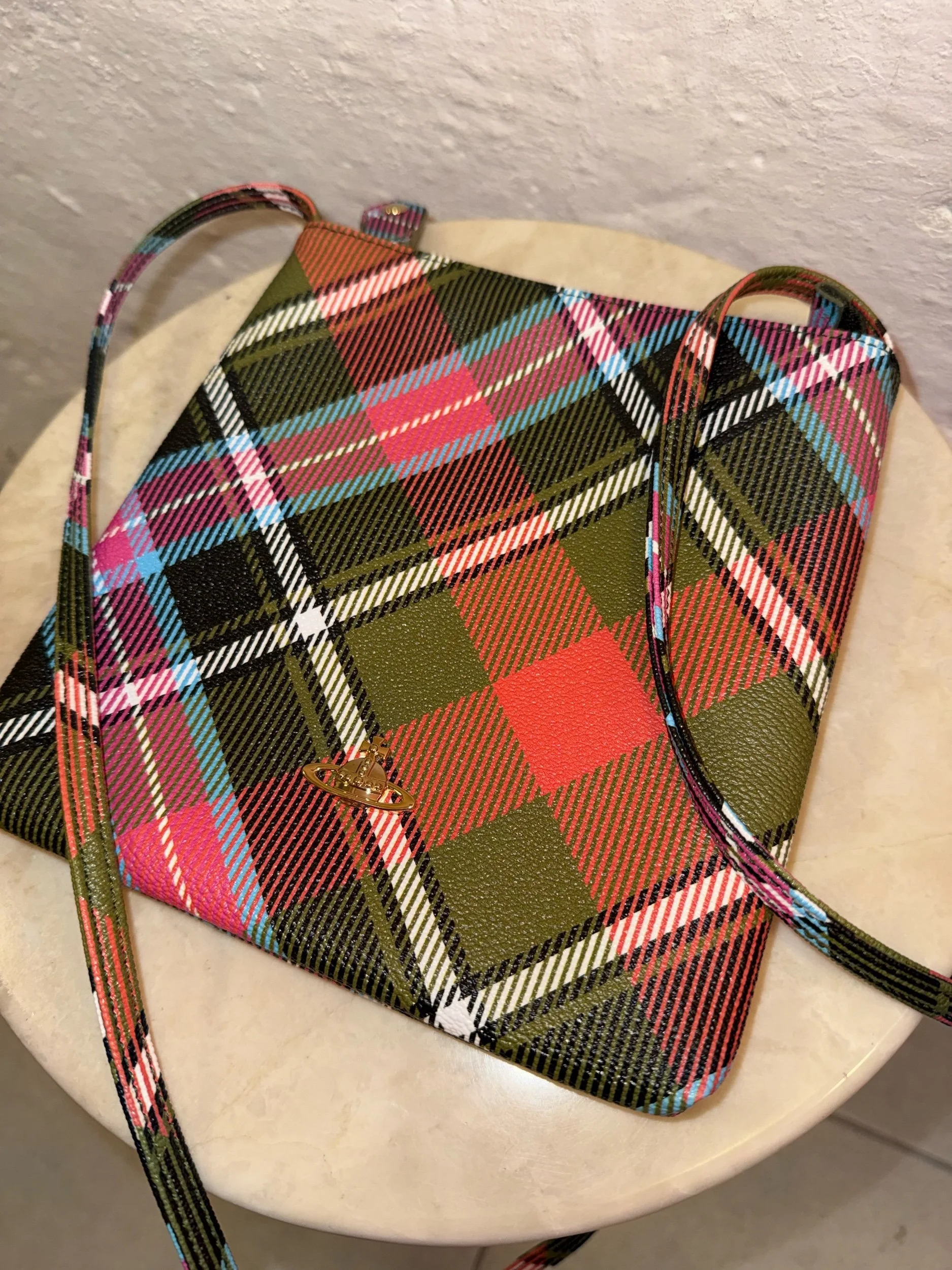 This is the Derby square crossbody bag by Vivienne Westwood in the brand’s iconic ‘New Exhibition’ tartan pattern. This flat, square silhouette features the classic orb logo in silver and a single strap. Made in Italy.