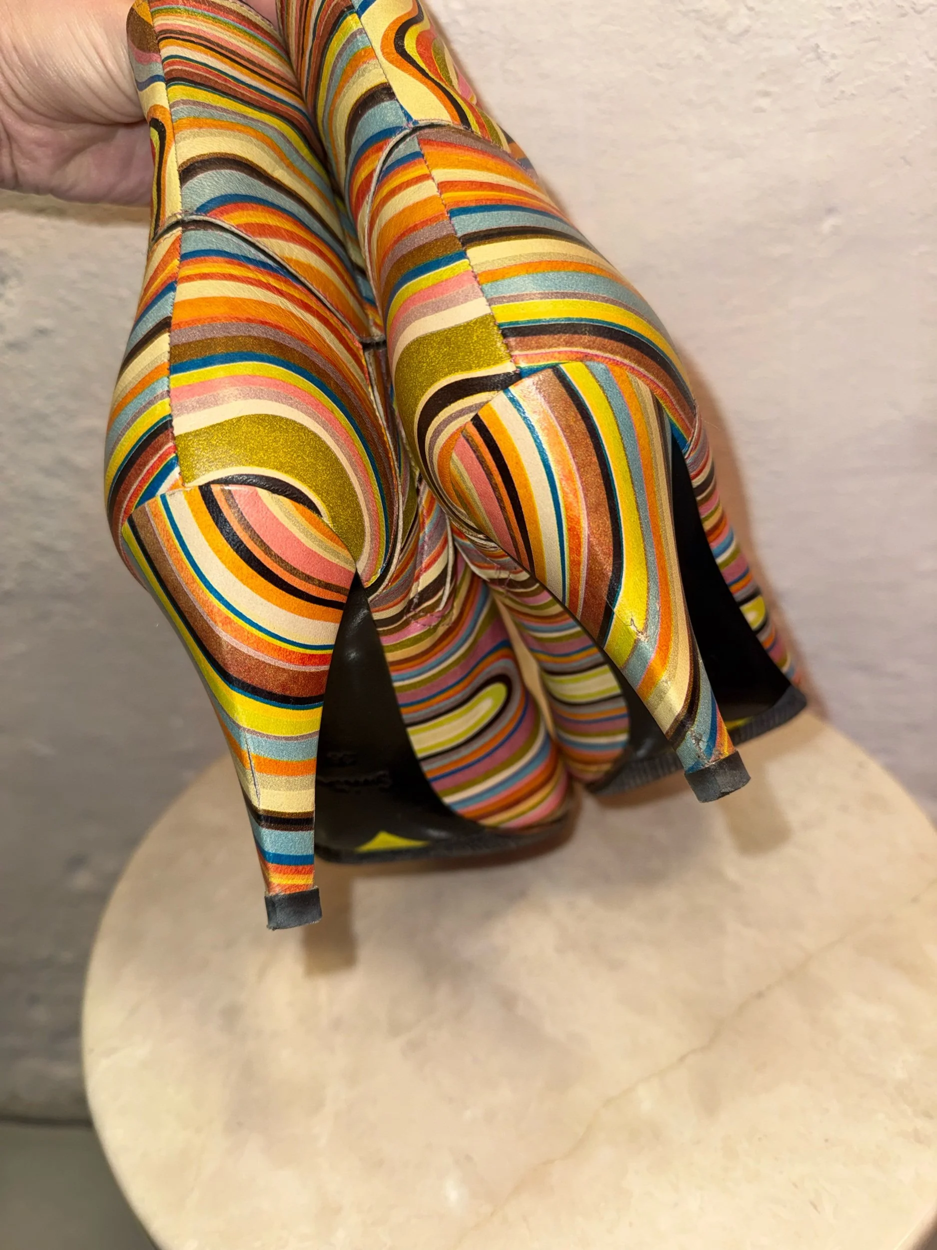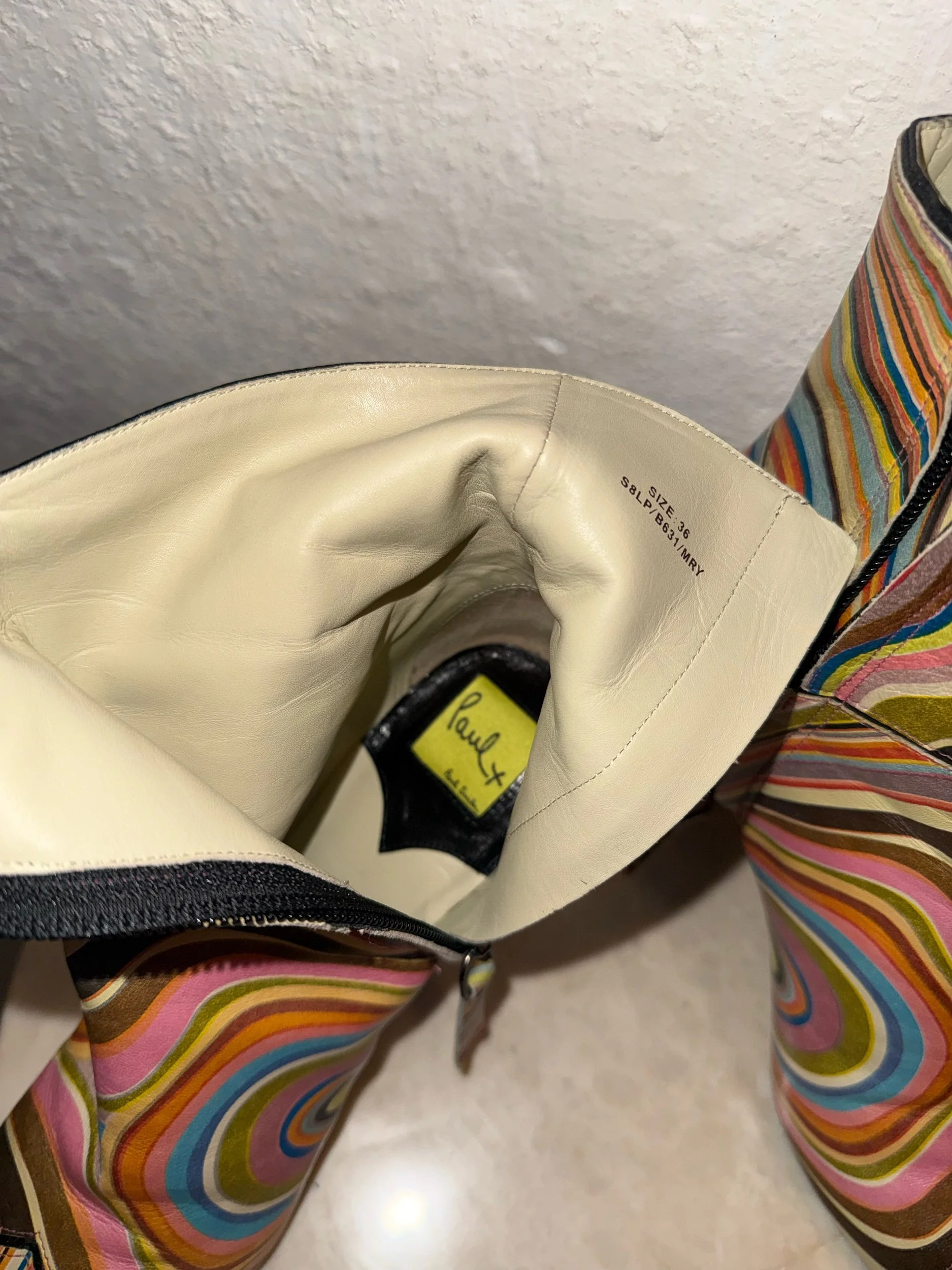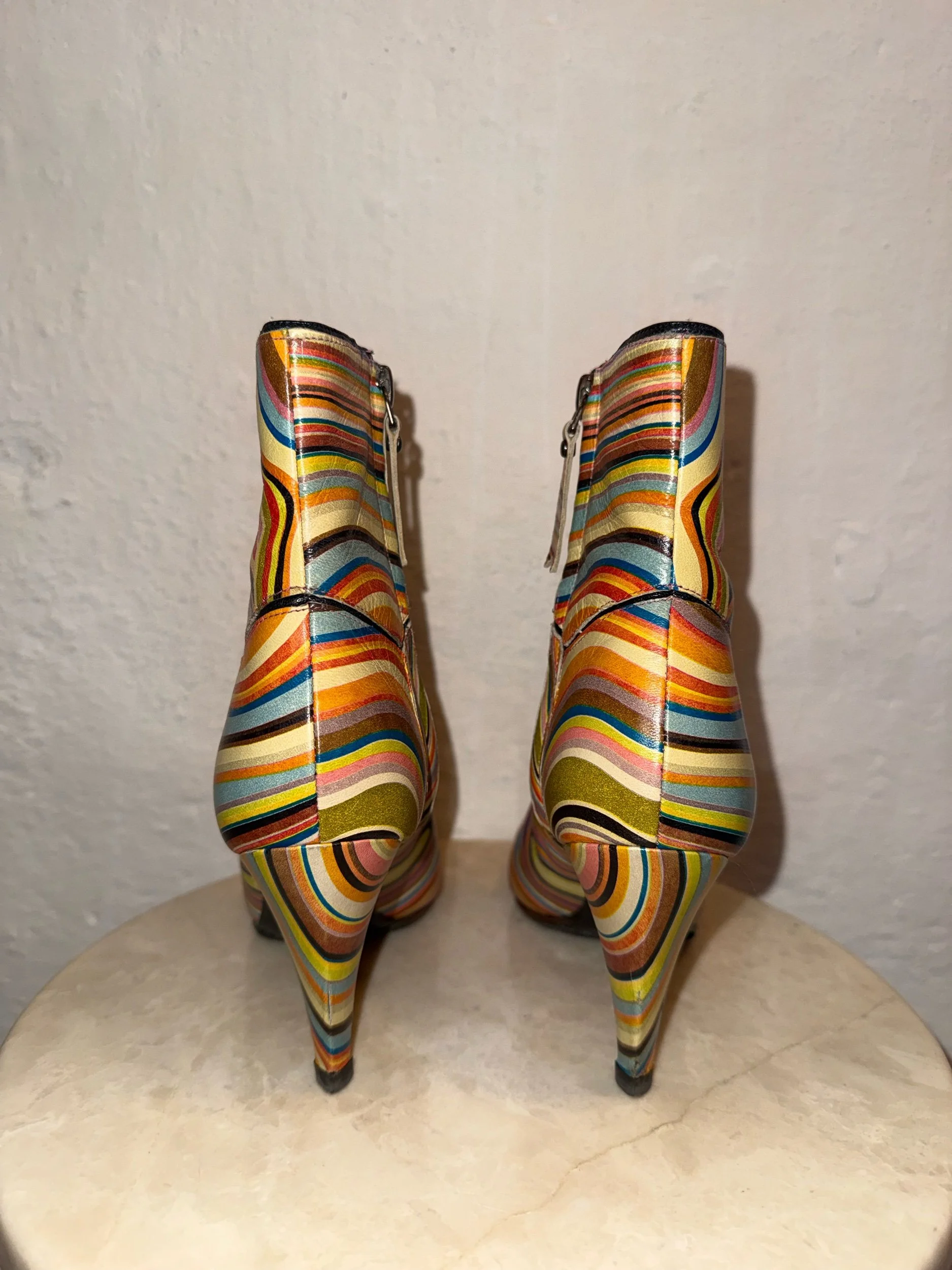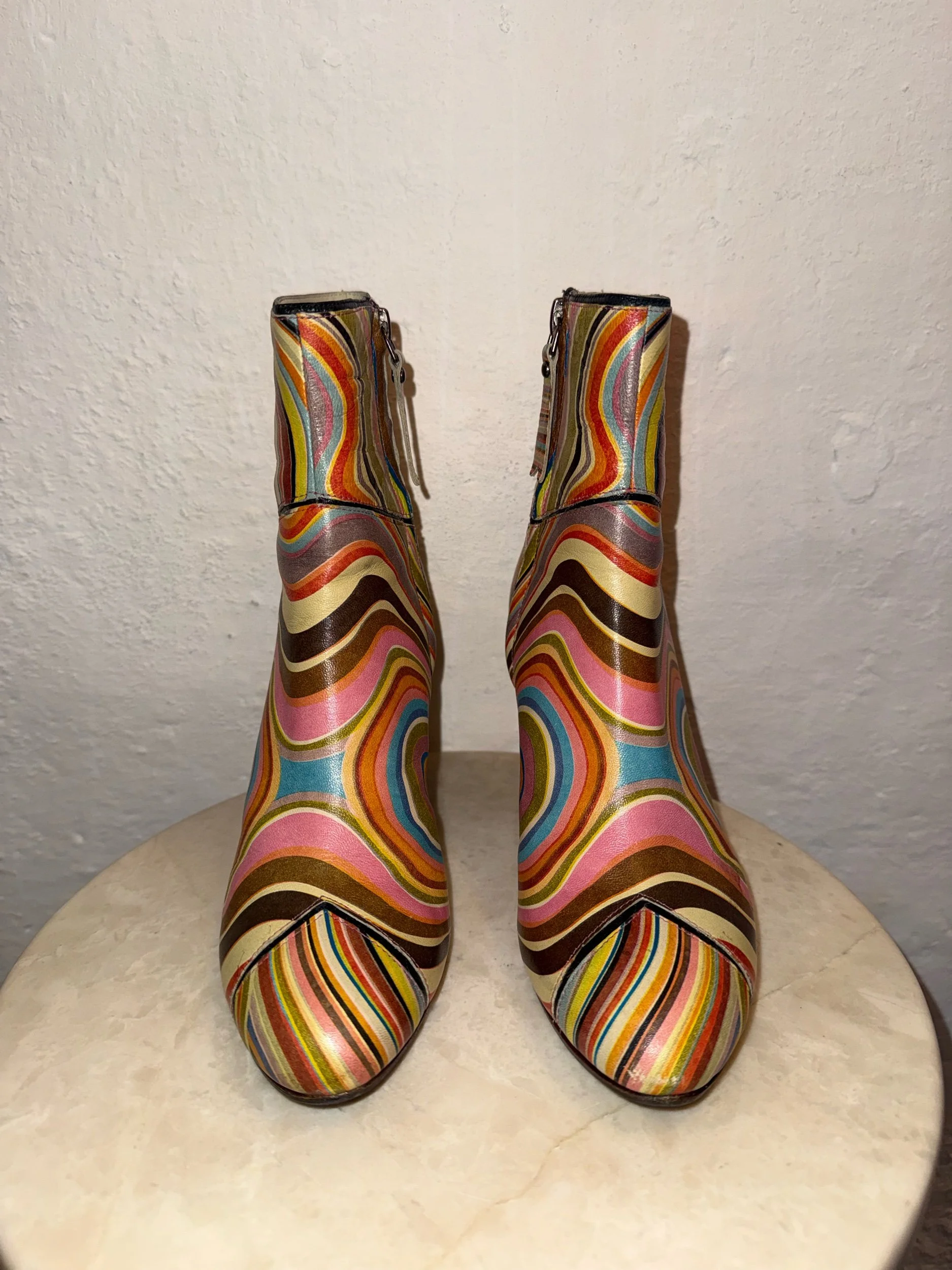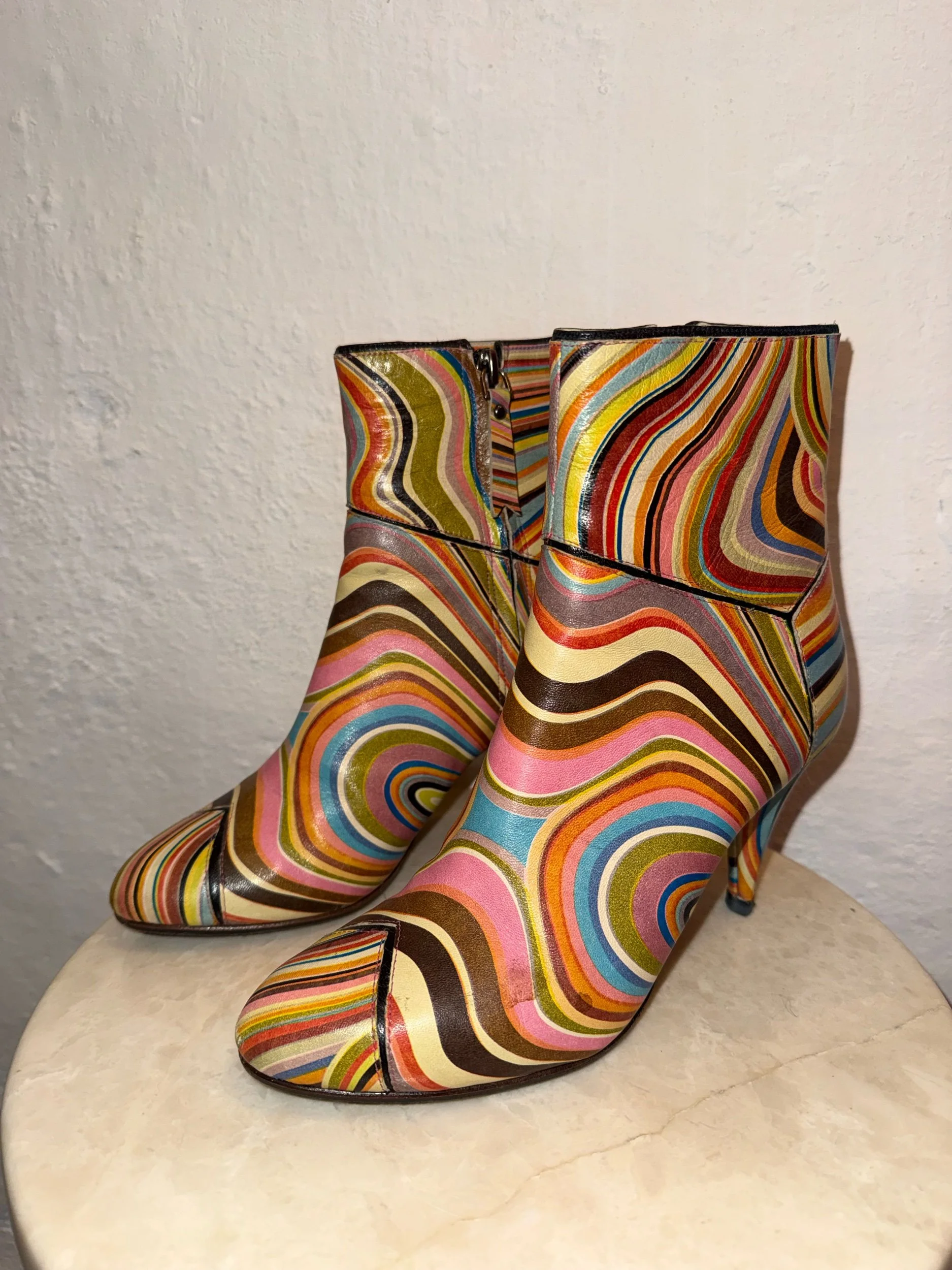 Early 2000’s Paul Smith signature swirl print leather ankle boots. These items are extremely collectible and sought after as PS discontinued this beloved print and it is rare to find them in this good condition.