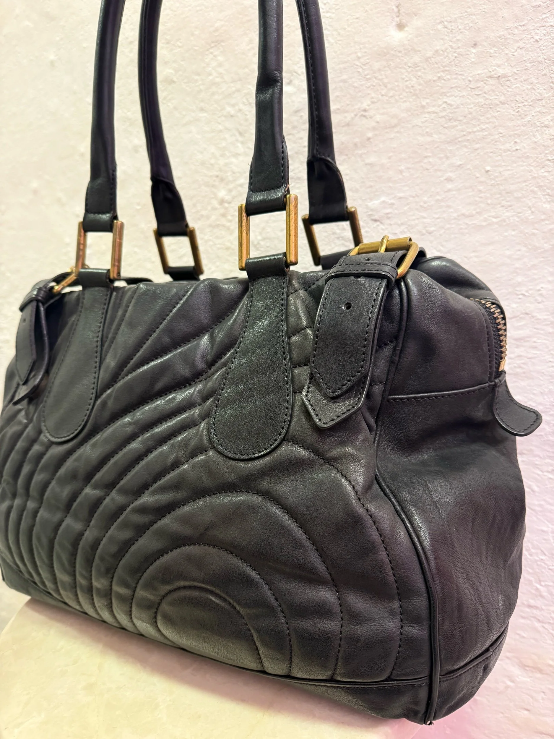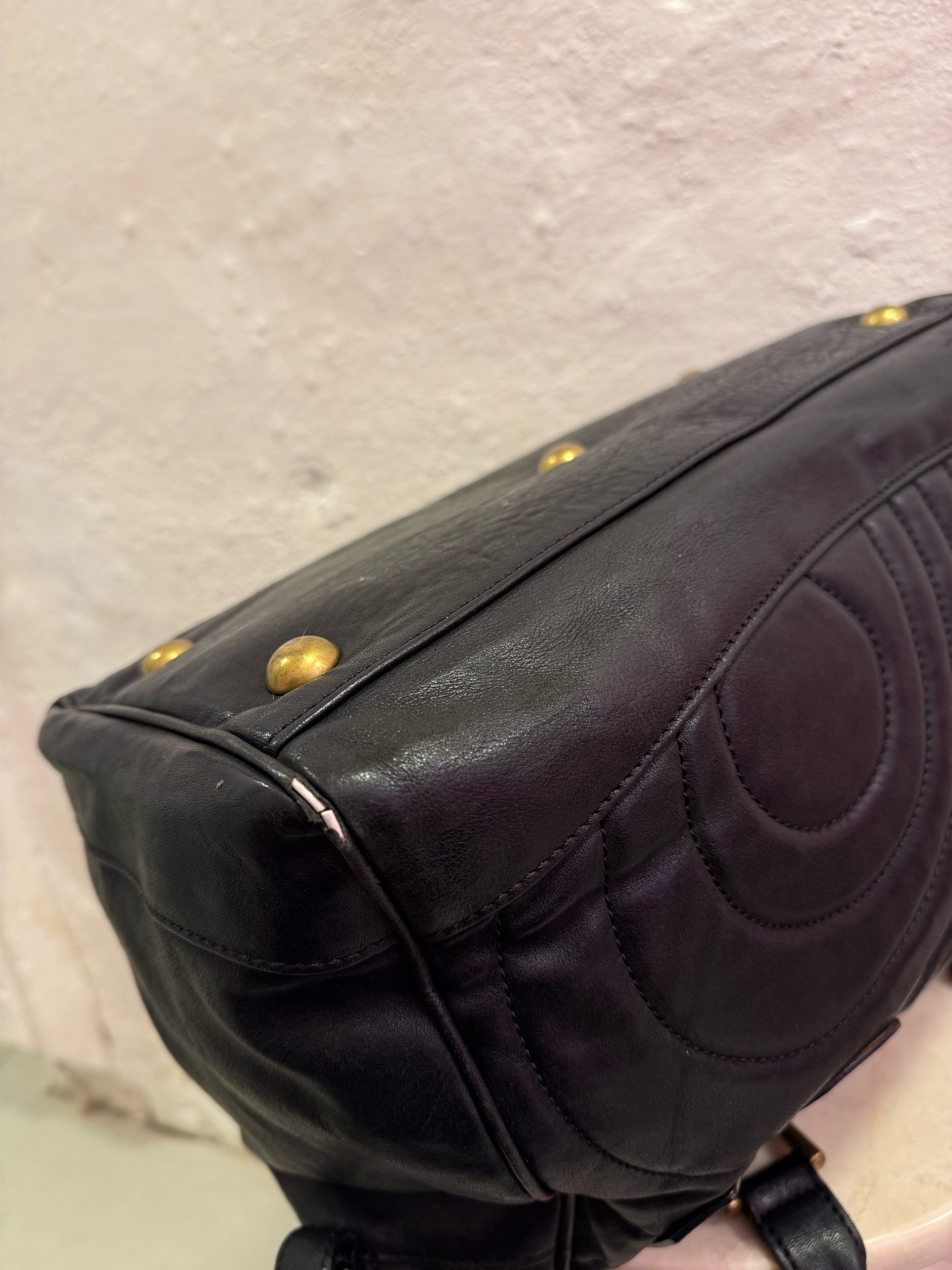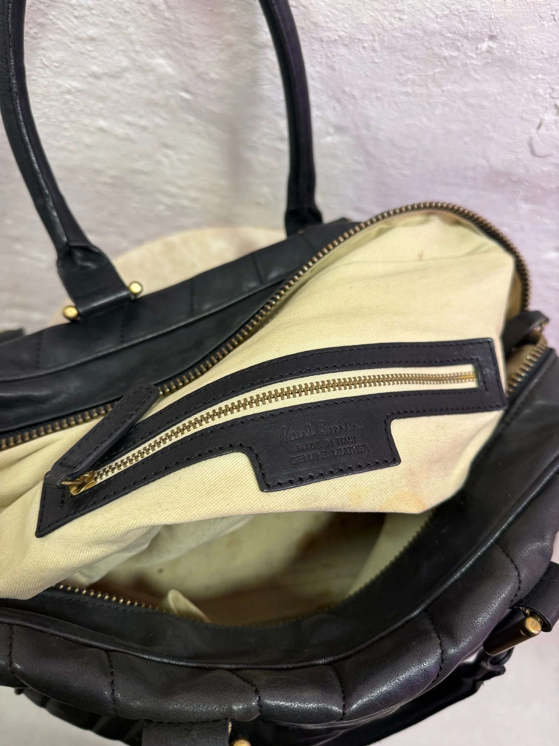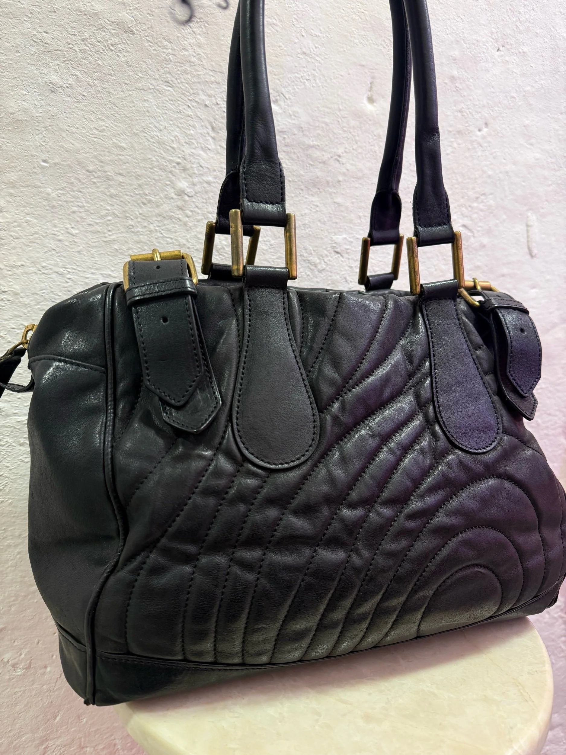 Early 2000’s Paul Smith black large leather shoulder bag with embroidered/ quilted swirl print texture.