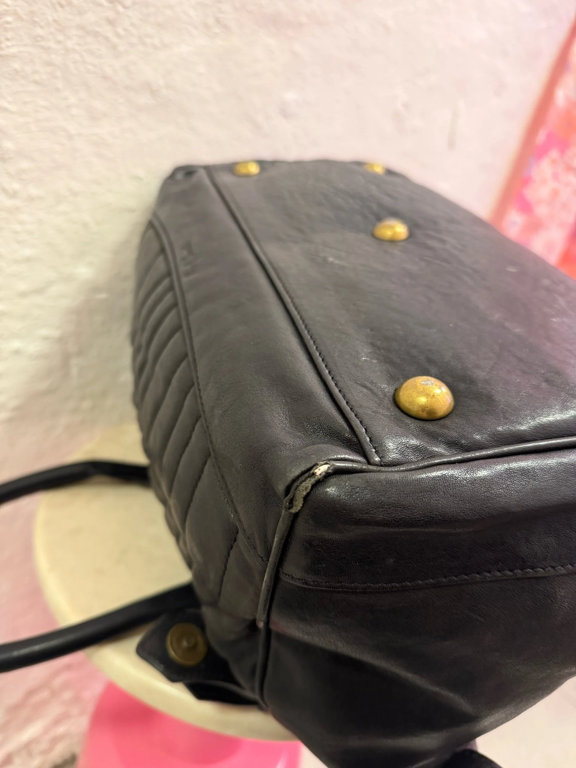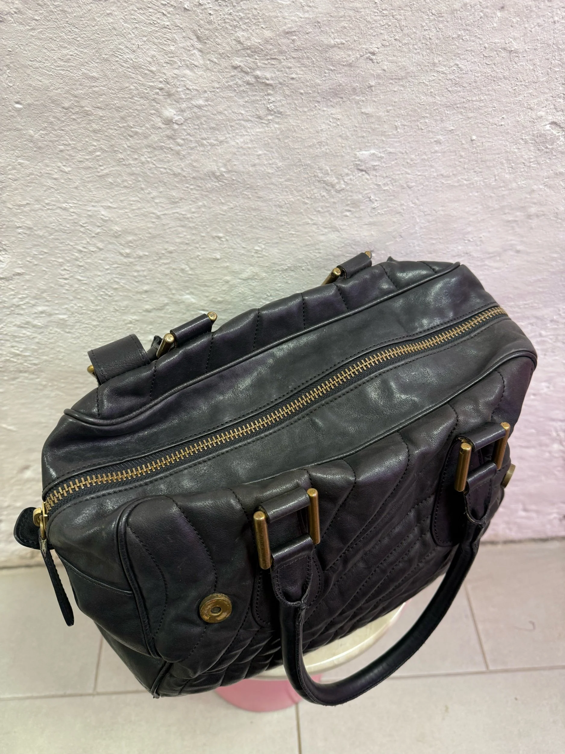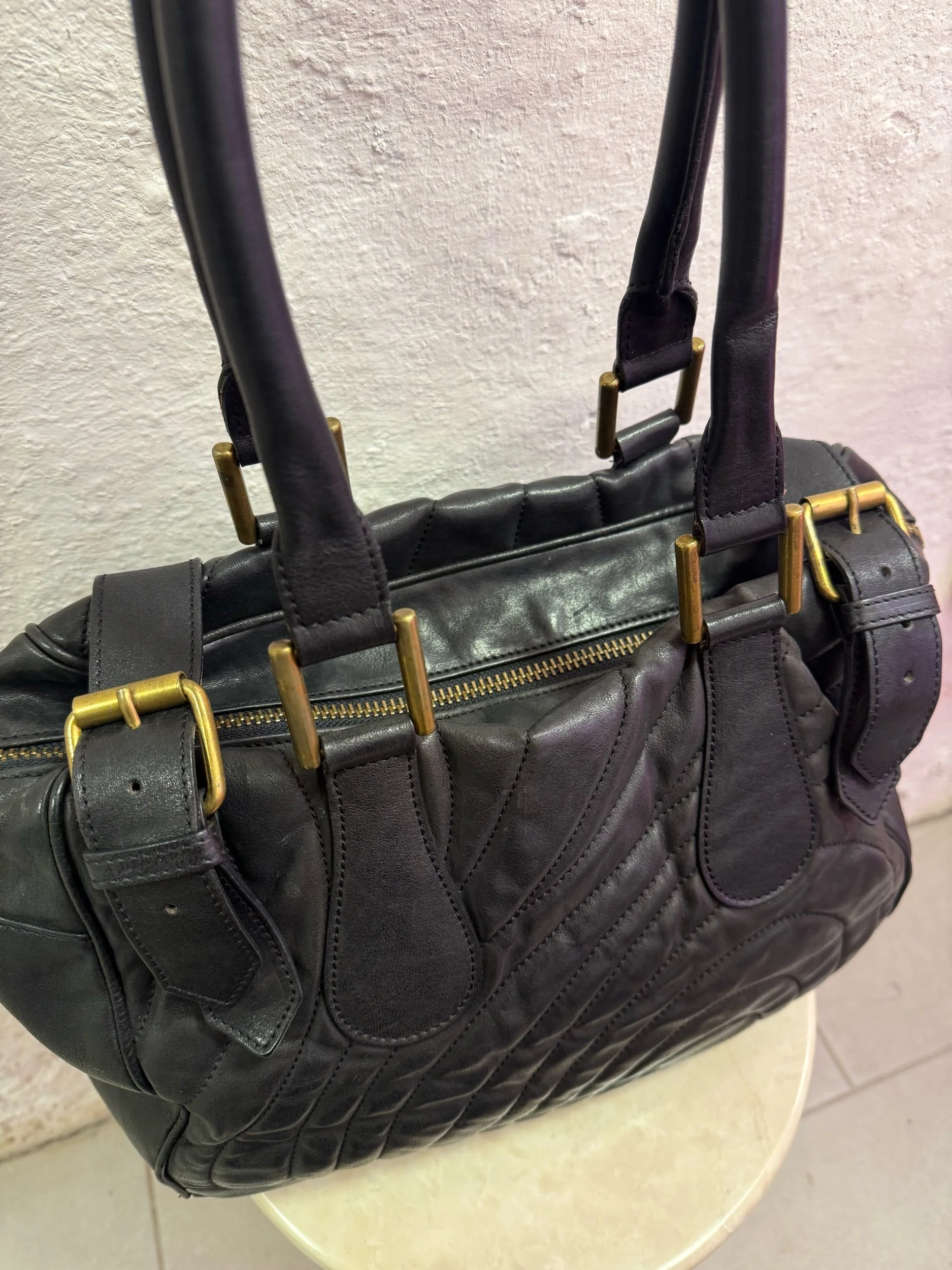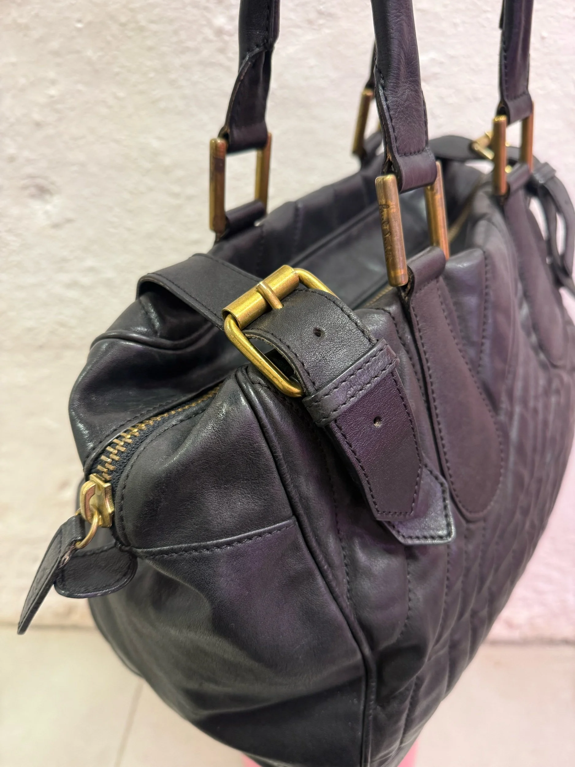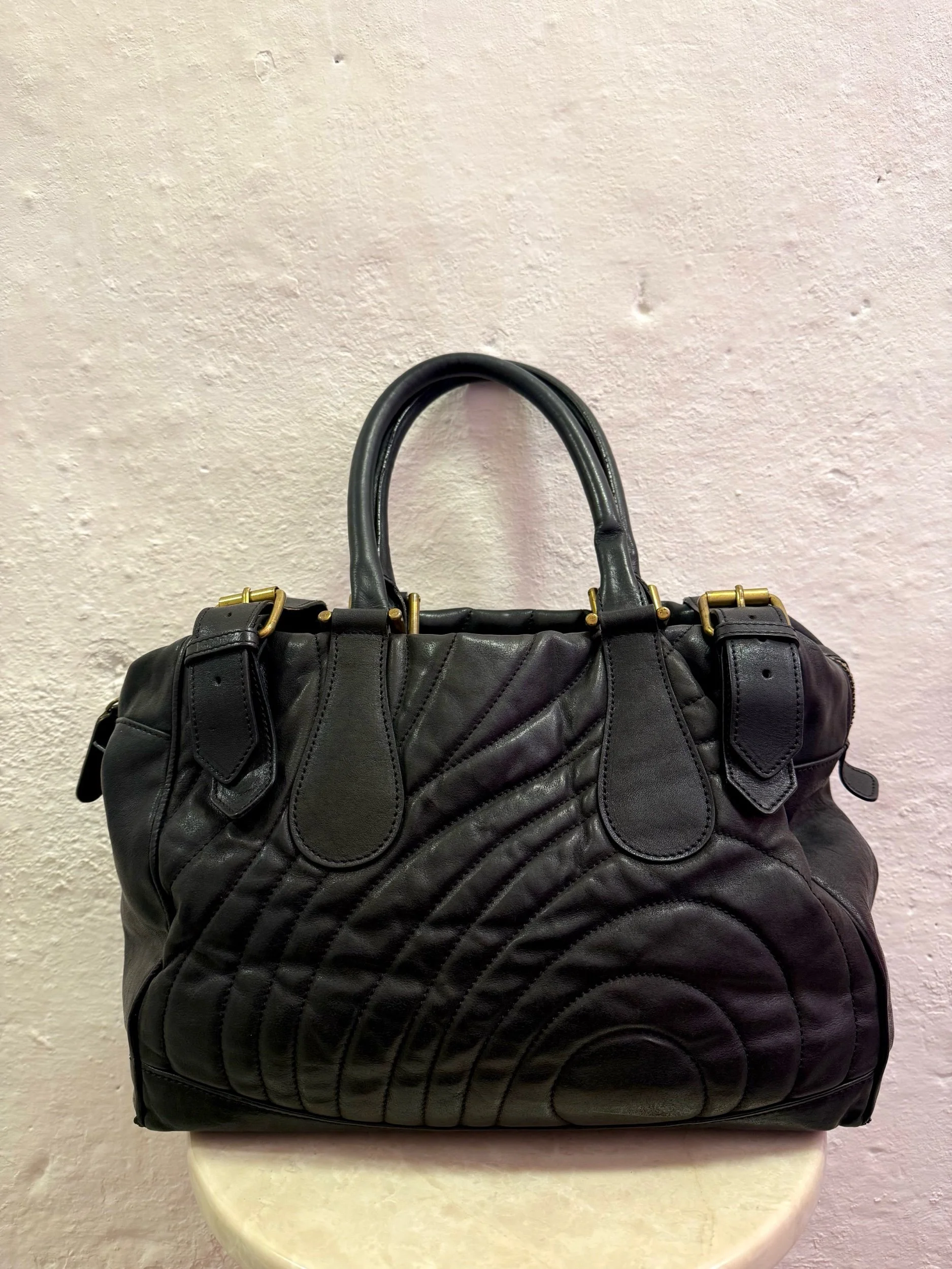 Early 2000’s Paul Smith black large leather shoulder bag with embroidered/ quilted swirl print texture.