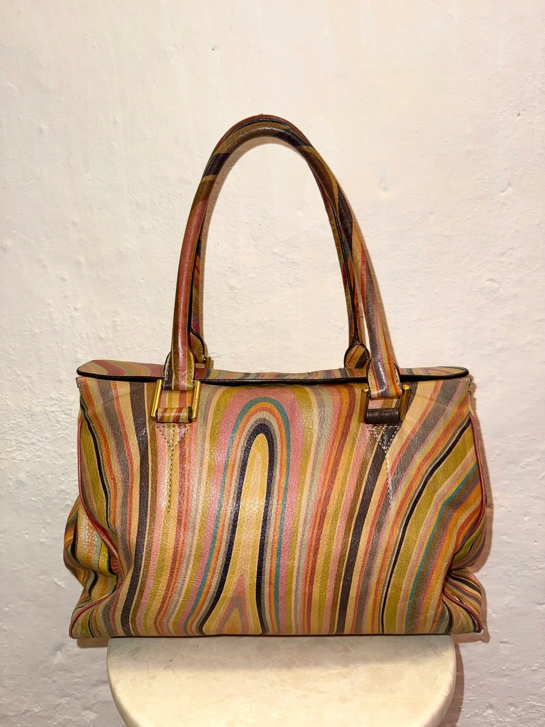 Early 2000’s Paul Smith signature swirl print large shoulder bag in the original swirl print leather. These bags are extremely collectible and sought as PS discontinued this beloved print, especially in this good condition.