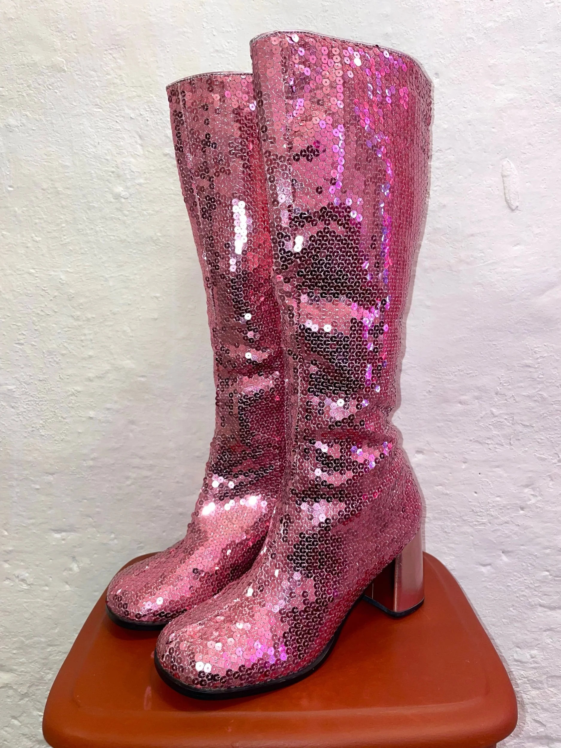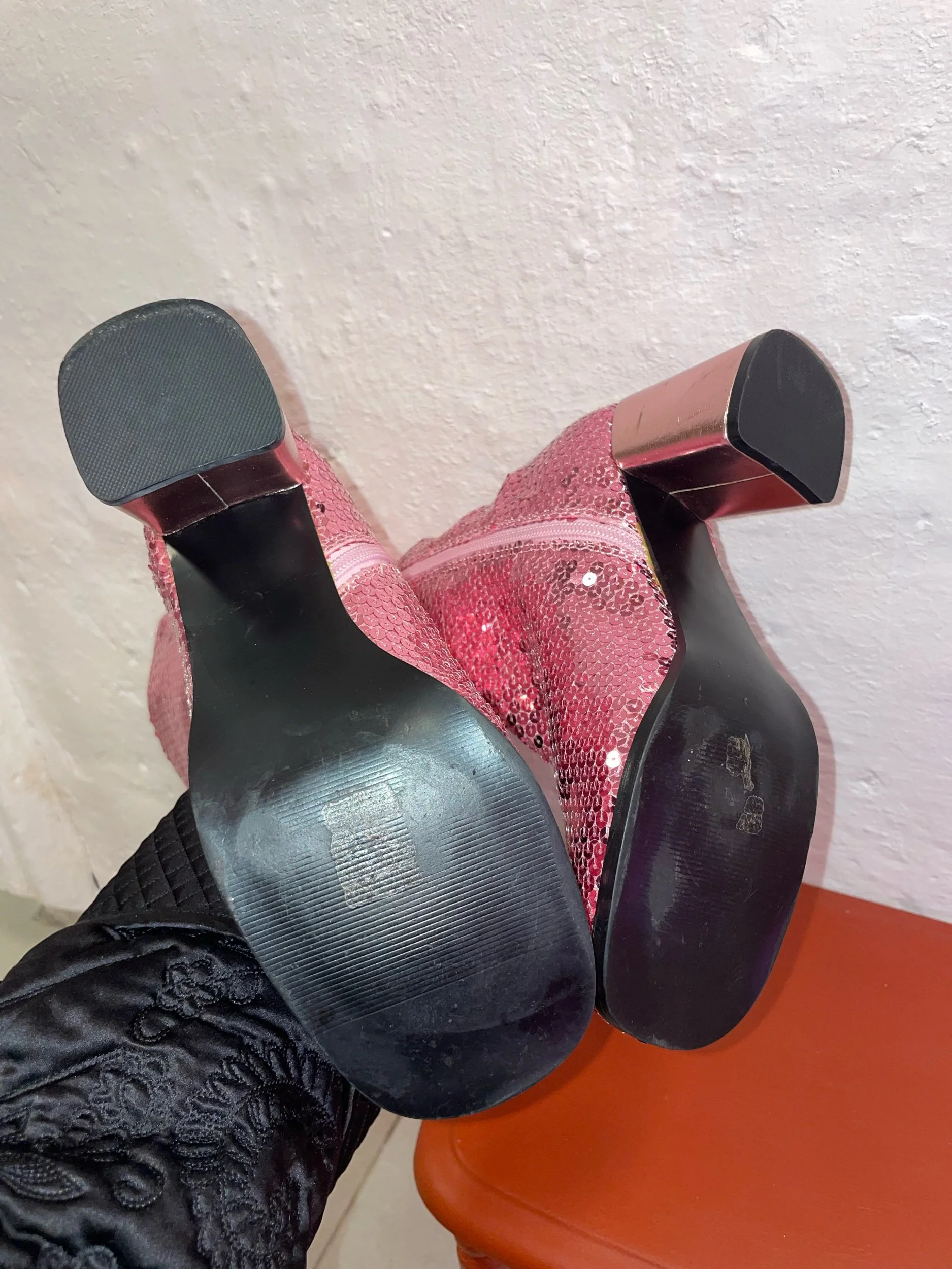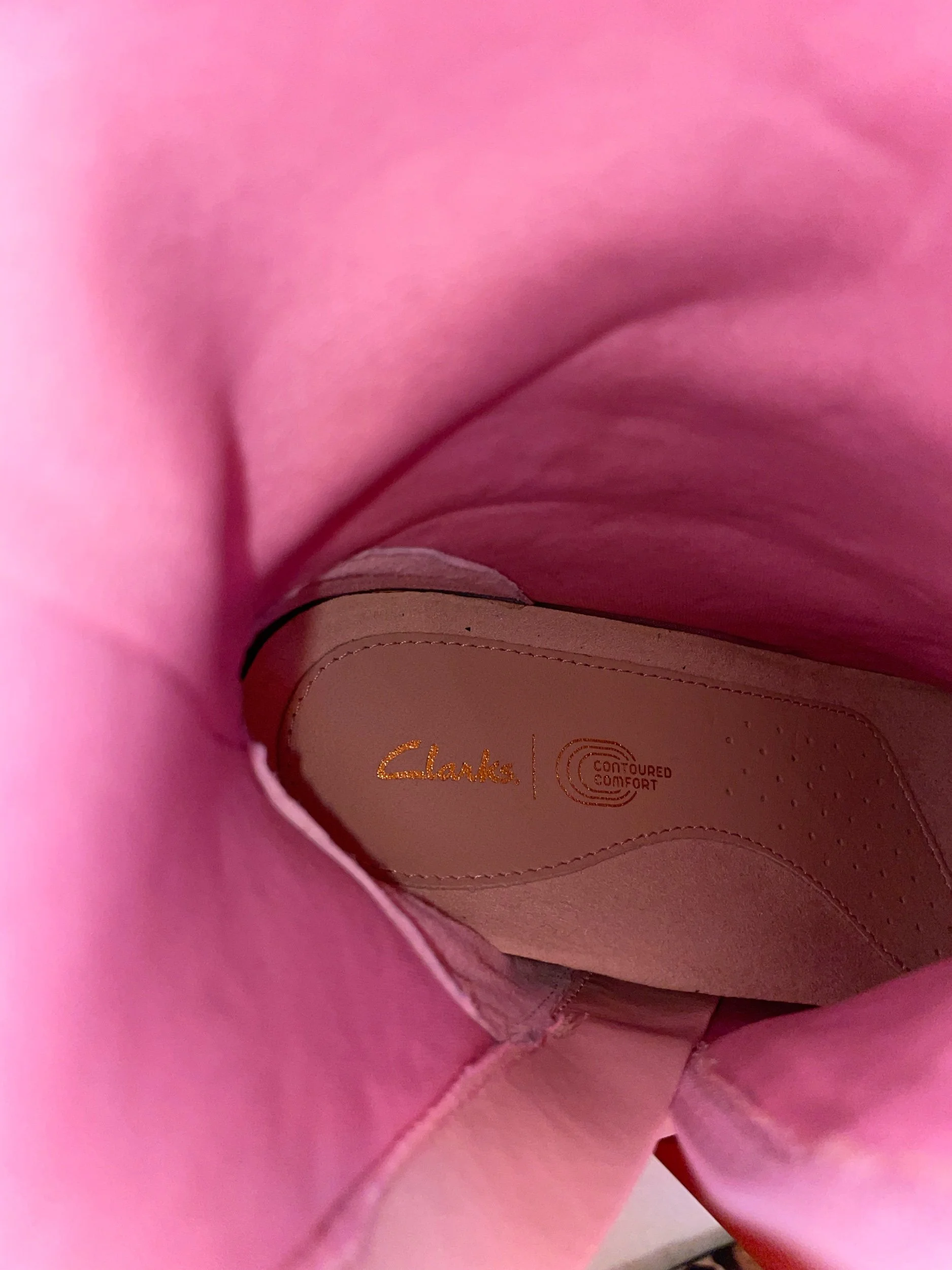 Vintage Early 2000’s Clarks Pink Seauin Block Heel Gogo boots. Due to the Clarks sole, they are the comfiest boot ever!