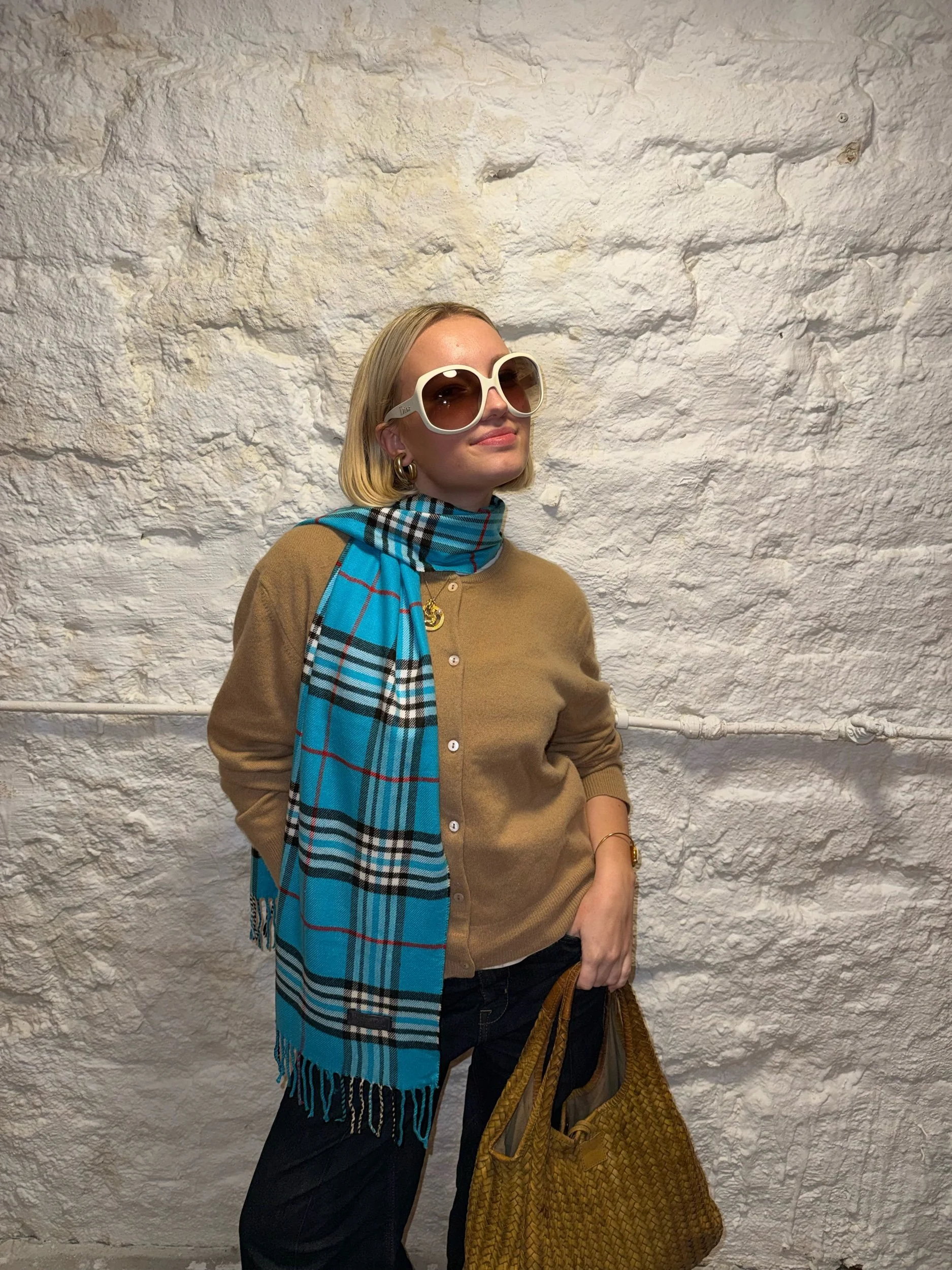 1990s vintage Burberry lambswool scarf, classic nova check in turquoise/ blue.
